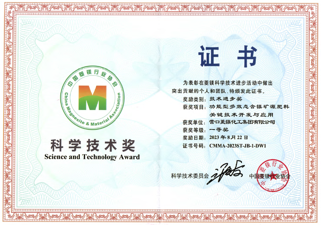 多年來,營口菱鎂化工集團(tuán)積極實(shí)施創(chuàng)新發(fā)展戰(zhàn)略,重點(diǎn)圍繞菱鎂礦等特種資源在農(nóng)業(yè)領(lǐng)域應(yīng)用,不斷加強(qiáng)基礎(chǔ)研究和應(yīng)用技術(shù)攻關(guān),已在含鎂系列新型中、微量元素肥料關(guān)鍵技術(shù)、工藝和產(chǎn)品等方面取得了重大突破,擁有多項(xiàng)核心技術(shù)和自主知識產(chǎn)權(quán),總體技術(shù)達(dá)到國內(nèi)領(lǐng)先水平。本項(xiàng)殊榮的獲得是對營口菱鎂化工集團(tuán)在行業(yè)地位、創(chuàng)新能力、生產(chǎn)技術(shù)水平、市場認(rèn)可度等多方面的肯定,彰顯企業(yè)拓展菱鎂礦在農(nóng)業(yè)領(lǐng)域高水平應(yīng)用實(shí)力,為進(jìn)一步提高菱鎂礦綜合利用及促進(jìn)菱鎂產(chǎn)業(yè)轉(zhuǎn)型升級開辟了新途徑。集團(tuán)將始終按照“好產(chǎn)品源自好原料”發(fā)展理念,研發(fā)高質(zhì)量產(chǎn)品,開拓新業(yè)務(wù),不斷提升企業(yè)價值,為行業(yè)健康發(fā)展貢獻(xiàn)智慧和力量。