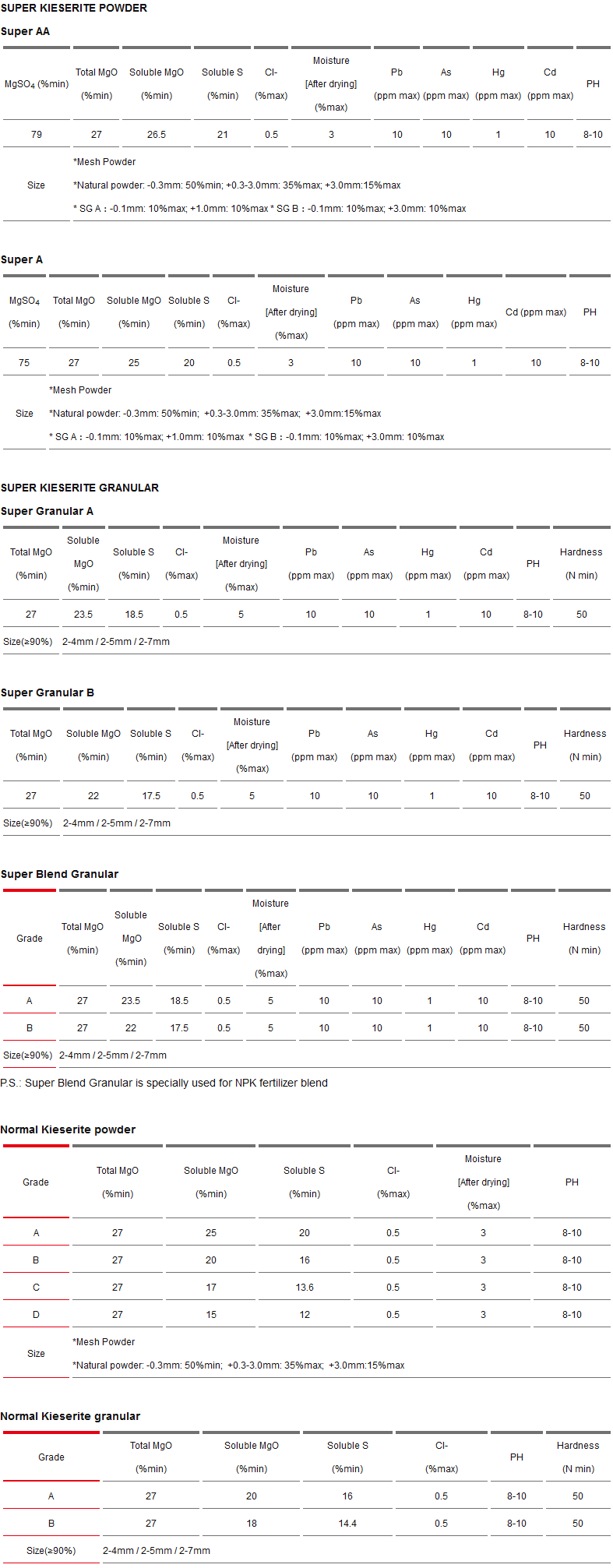| Natural powder | Mesh powder | Kieserite Granular |